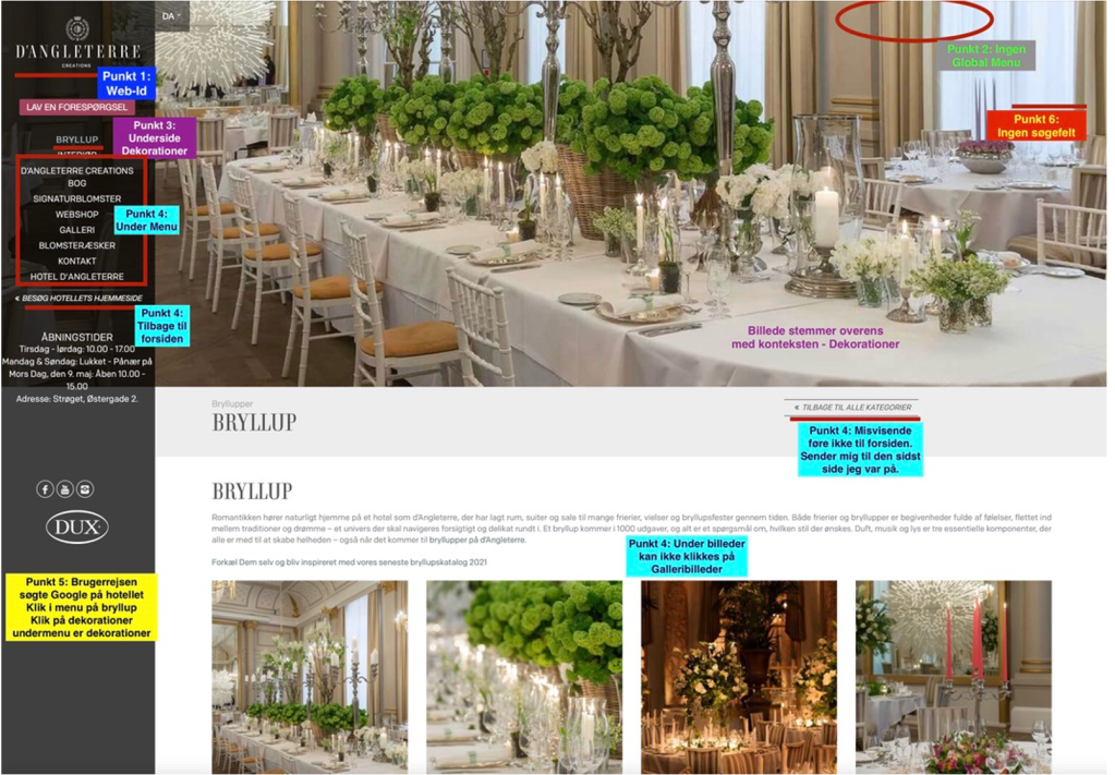 En google søgning på hotellet og landede på hotellets forside. Herefter var der mulighed for 6 menupunkter, hvor jeg valgte den sidste, som var det jeg søgte ’bryllupper’. Her blive jeg navigeret til en del andre muligheder omhandlende alt omkring et bryllup. Jeg valgte: ’dekorationer’. Det var hurtigt og enkelt. Point 3