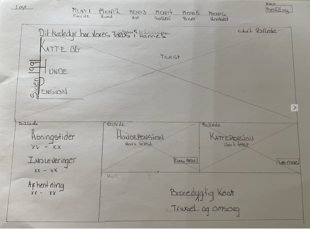 Efter denne analyse var jeg klar til at lave en sketching ud fra min plan af re-design af websiden. Jeg har vedhæftet min sketching af plan for forsiden til kameluld.dk.
