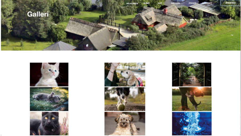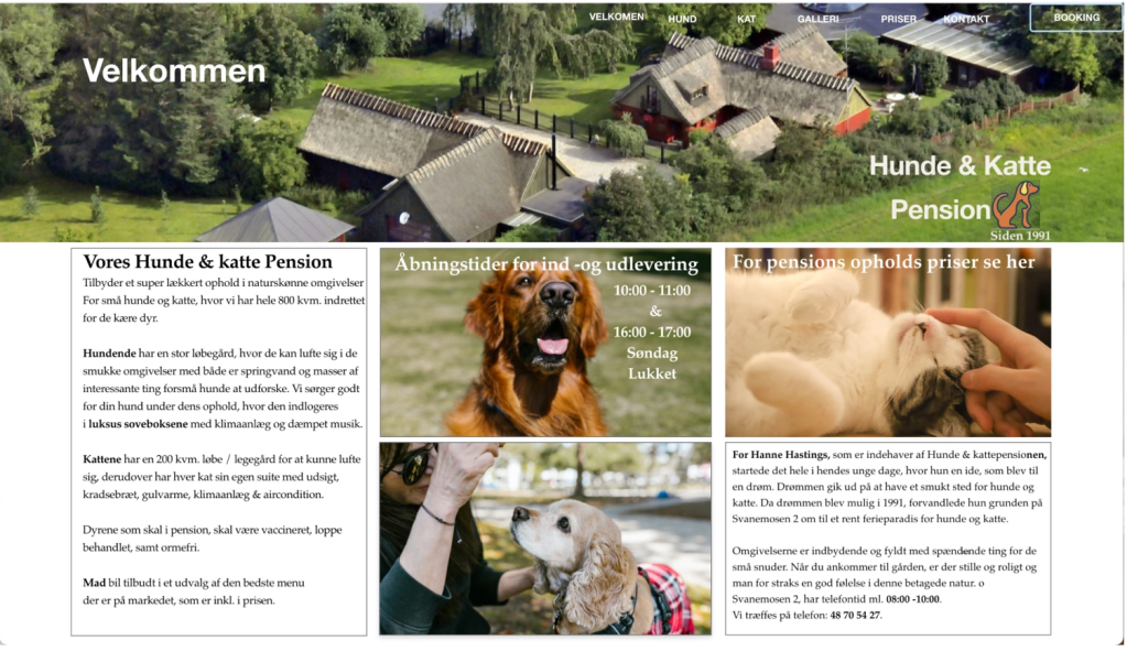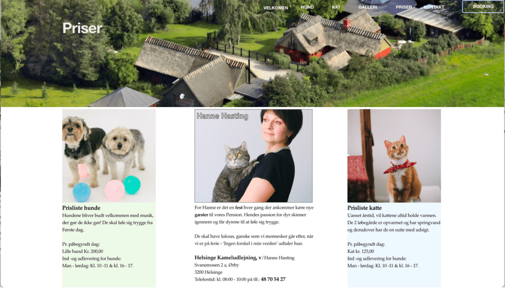 På siden Priser, valgte jeg at bruge space for ikke at overdøve med for meget info. Jeg har valgt at lave fed skrift til ord der skal være blikfang. Jeg vælger også at bruge samme header på alle siderne, for genkendelighed og at lægge fokus på dette skønne sted. Med stedets faciliteter og Hanne’s indfaldsvinkel valgte jeg at skabe lidt feststemning, for at gøre siden med priser lidt mere farveriggennem de billeder jeg valgte.