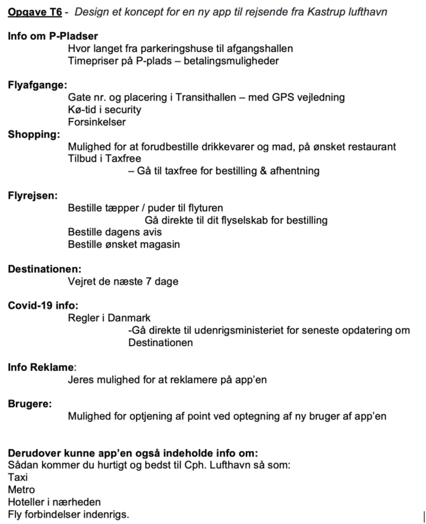 2. opgave. Den anden opgave er længere nede på siden og omhandler: Design et koncept for en ny app til rejsende fra Kastrup lufthavn.