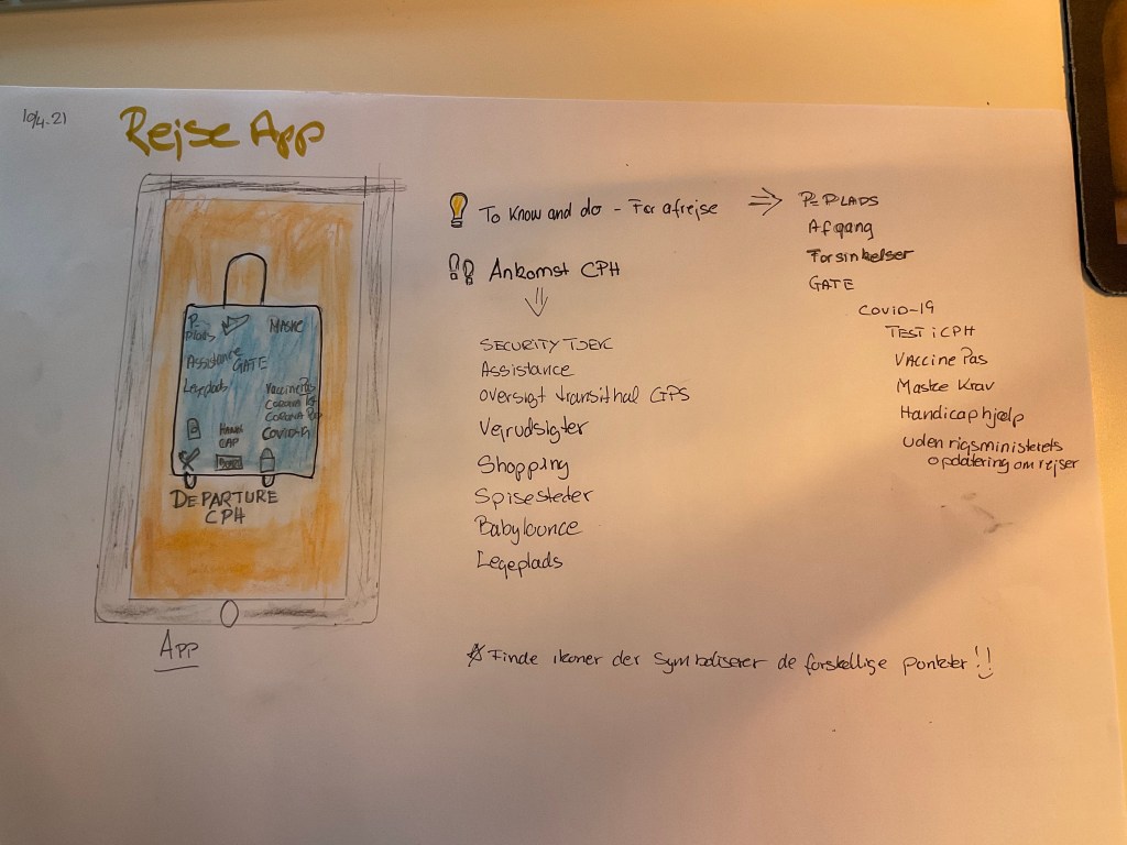 Der findes allerede rigtig mange app’s omkring rejser fra Kastrup Lufthavn – derfor er der jo stadig plads til fornyelse. Jeg har haft en del fokus på Covid-19 og ellers gennemtænkt, hvad jeg førhen har manglet af info, for at lette mine rejser fra CPH lufthavn. Jeg valgte at gå lidt ud over alle dem som allerede findes, og mere have et omdrejningspunkt omkring en kuffert, som har et stort nonverbalt udtryk – rejse. På kufferten kunne jeg på klistre en masse ikoner, for at vise hvad denne app’s omhandlede. Ud fra min brainstorming fornyede jeg ikoner til en relevant oversigt jeg mente var brugbar for, at lette rejsen. Jeg viste omdrejningspunktet skulle være en kuffert og designet enkelt.